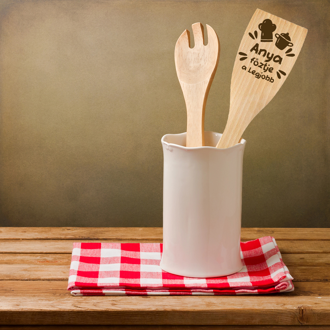 Ez a gravírozott fa spatula „Anya főztje a legjobb” felirattal és kedves mintával tökéletes ajándék minden házi tündérnek, aki szeretettel főz a családnak.
