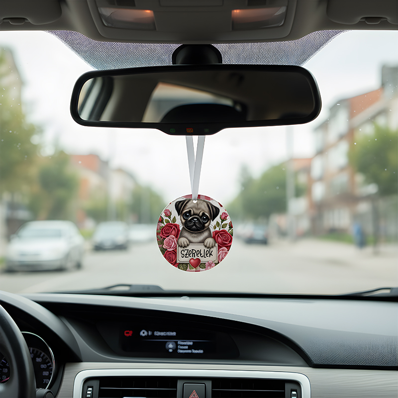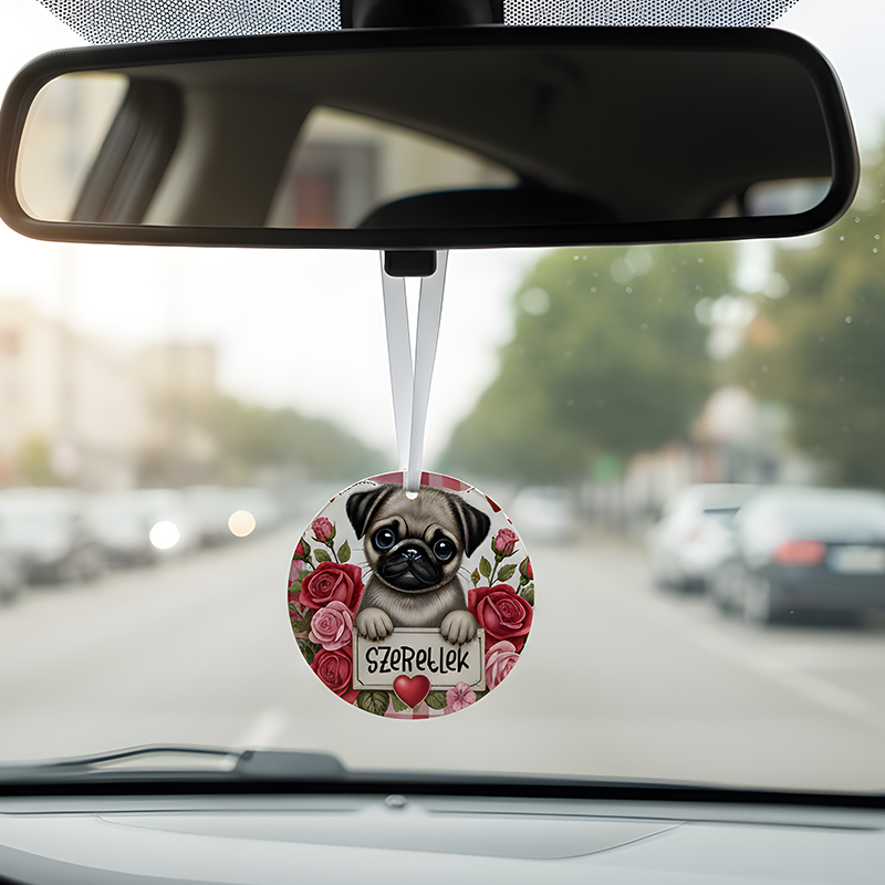 Tedd különlegessé a mindennapi utazásokat ezzel az aranyos, szívecskés hangulatú „Szeretlek” feliratos autós illatosítóval! A cuki Mopsz kutyus grafika és a romantikus üzenet nemcsak kellemes illatot, hanem jókedvet és szeretetet is hoz az autóba.