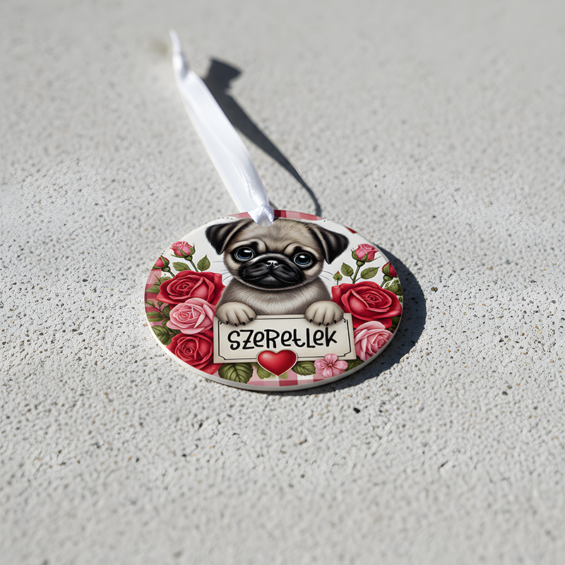 Minta: Mopsz, rózsák, „Szeretlek” felirat