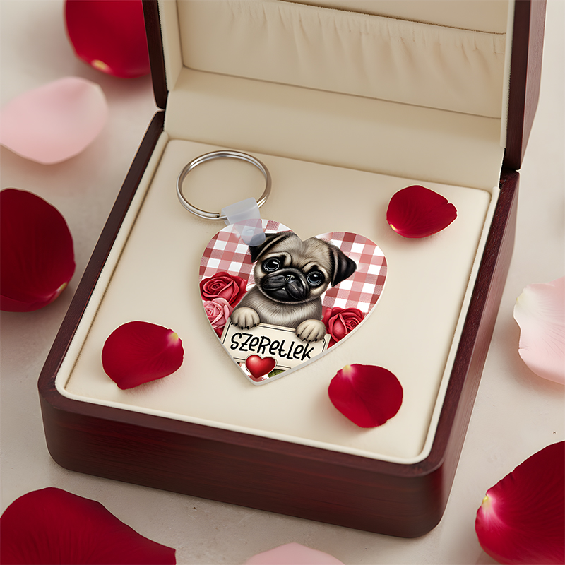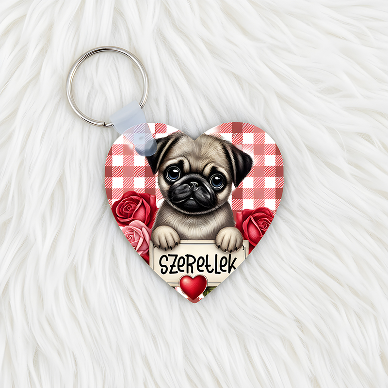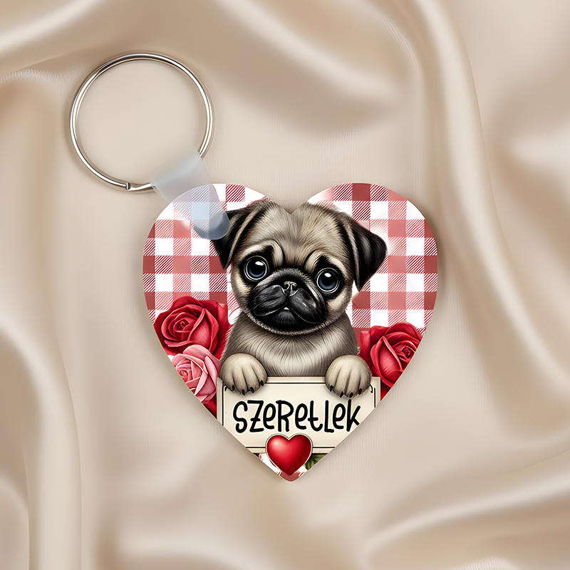 - Minta: Mopsz, rózsák, „Szeretlek” felirat
