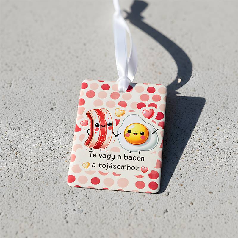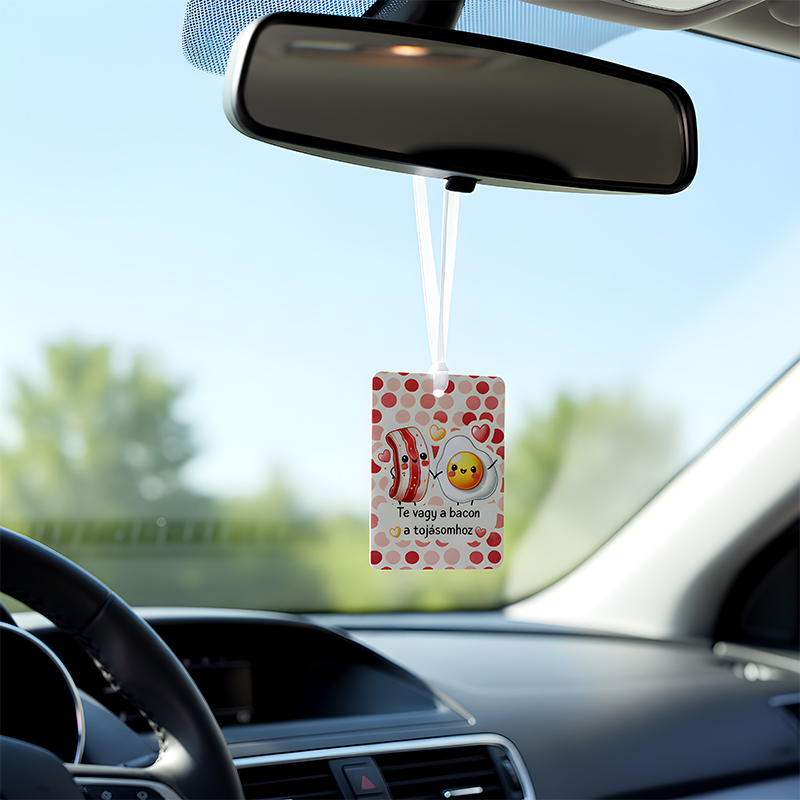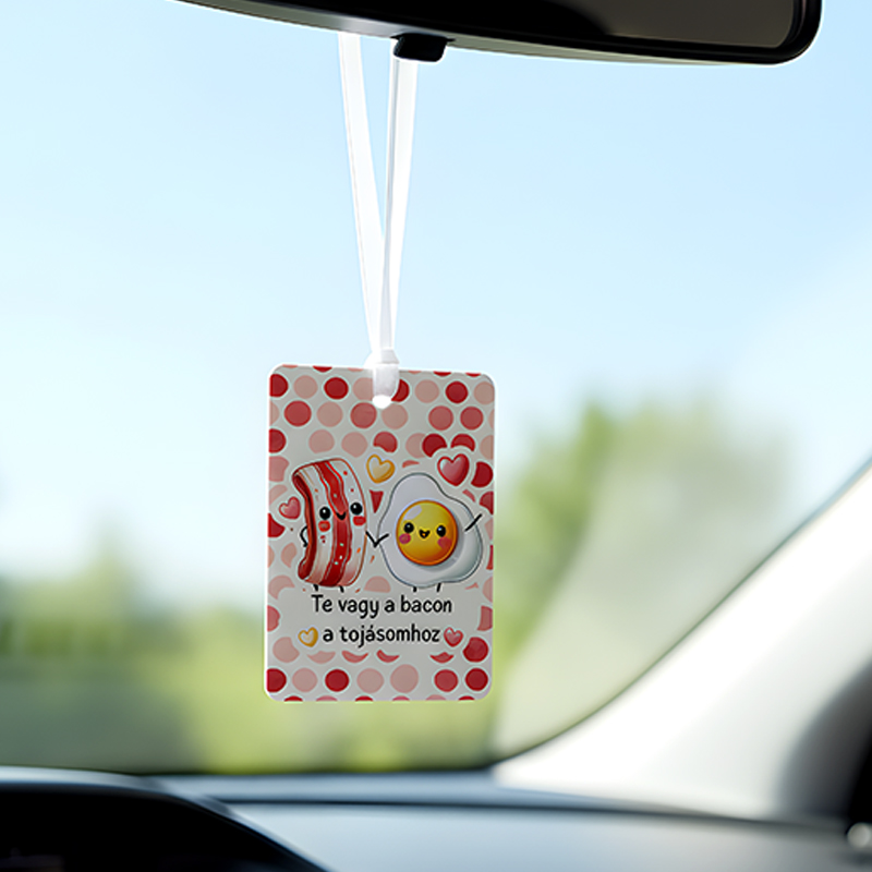 Ez a vidám, szerethető „Te vagy a bacon a tojásomhoz” feliratos autós illatosító tökéletes választás, ha egy kis humort és szeretetet vinnél a mindennapi autózásba.