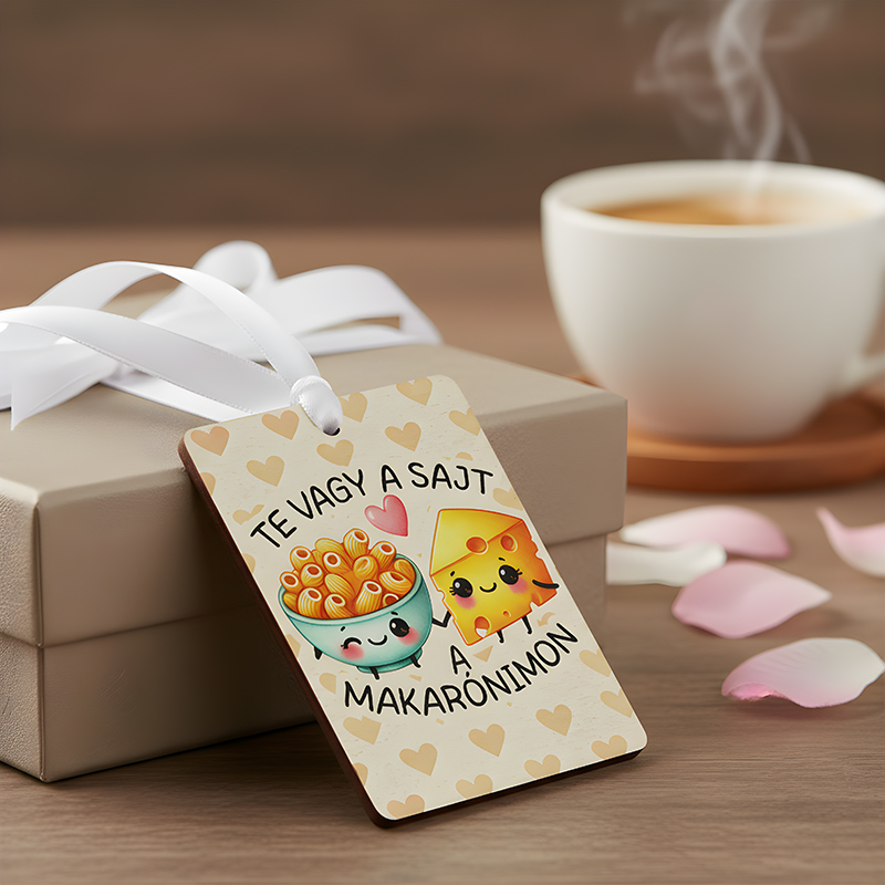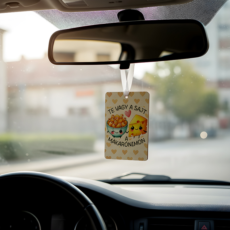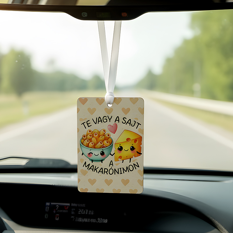 Ez a vidám, sárga alapszínű, szívecskékkel díszített „Te vagy a sajt a makarónimon” feliratos autós illatosító tökéletes választás, ha humorral szeretnéd kifejezni az összetartozást.